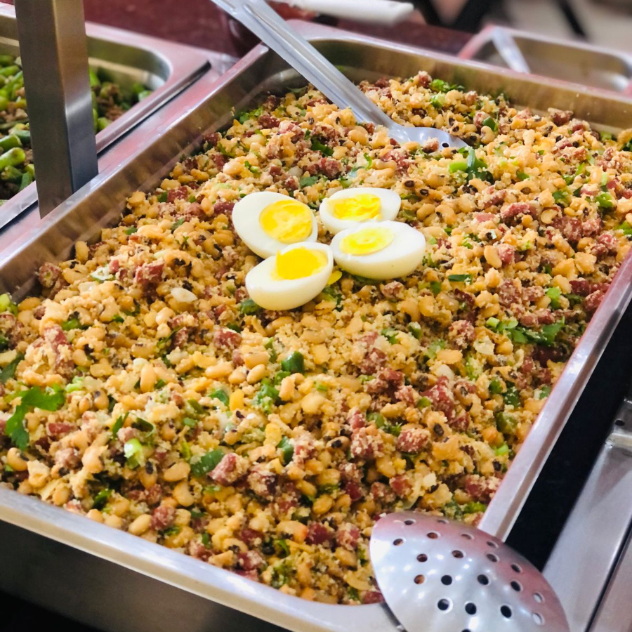 Acompanha: arroz, feijão, macarrão, legumes, farofa e frituras do Dia ( berinjela, batatas etc )(Foto Ilustrativa) 900 gramas de comida