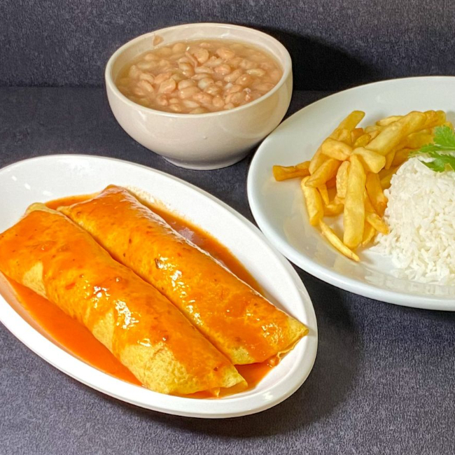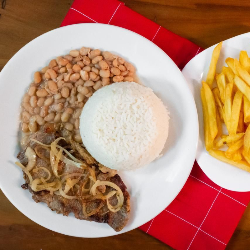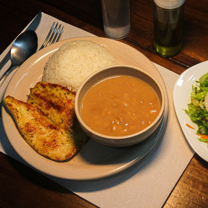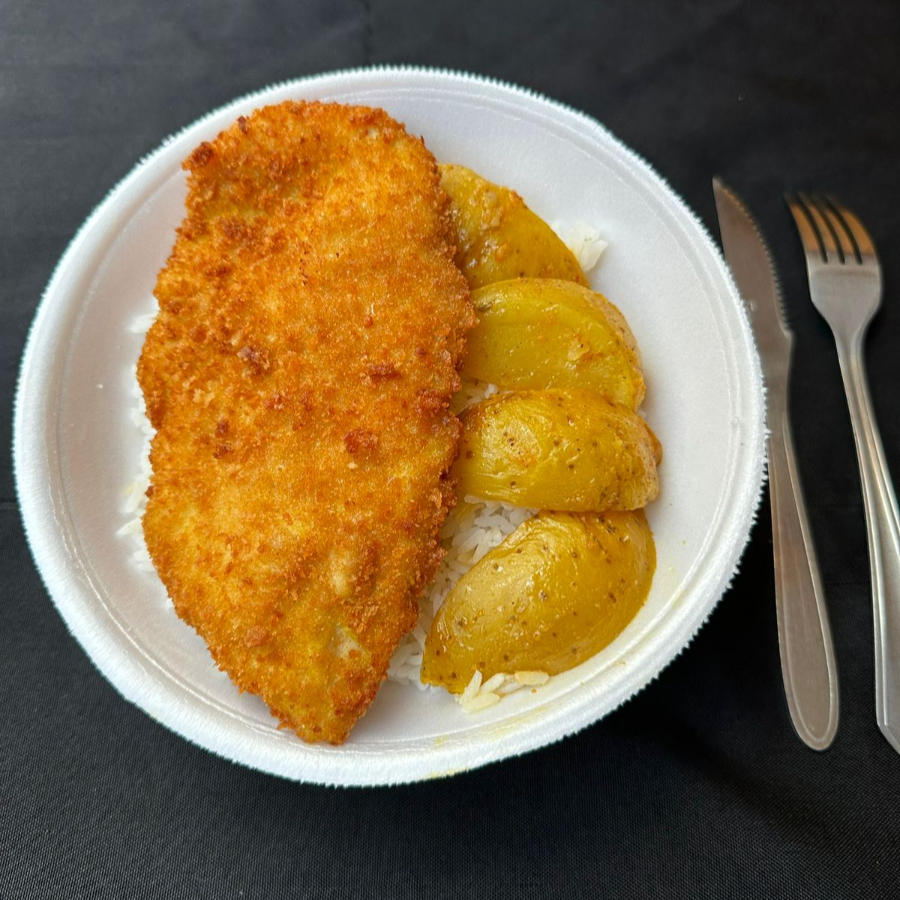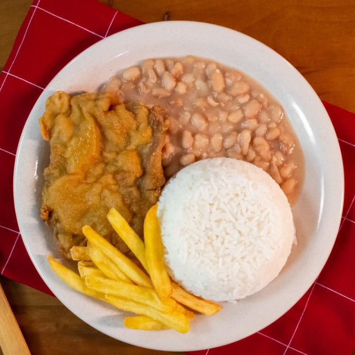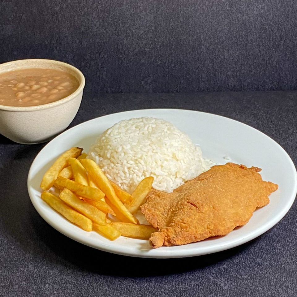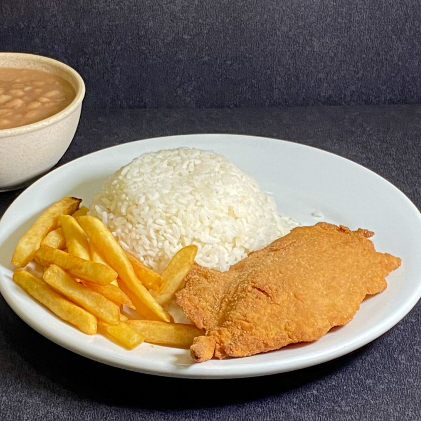acompanha: Arroz, Feijão, Batata Rustica e Filé de Frango empanado