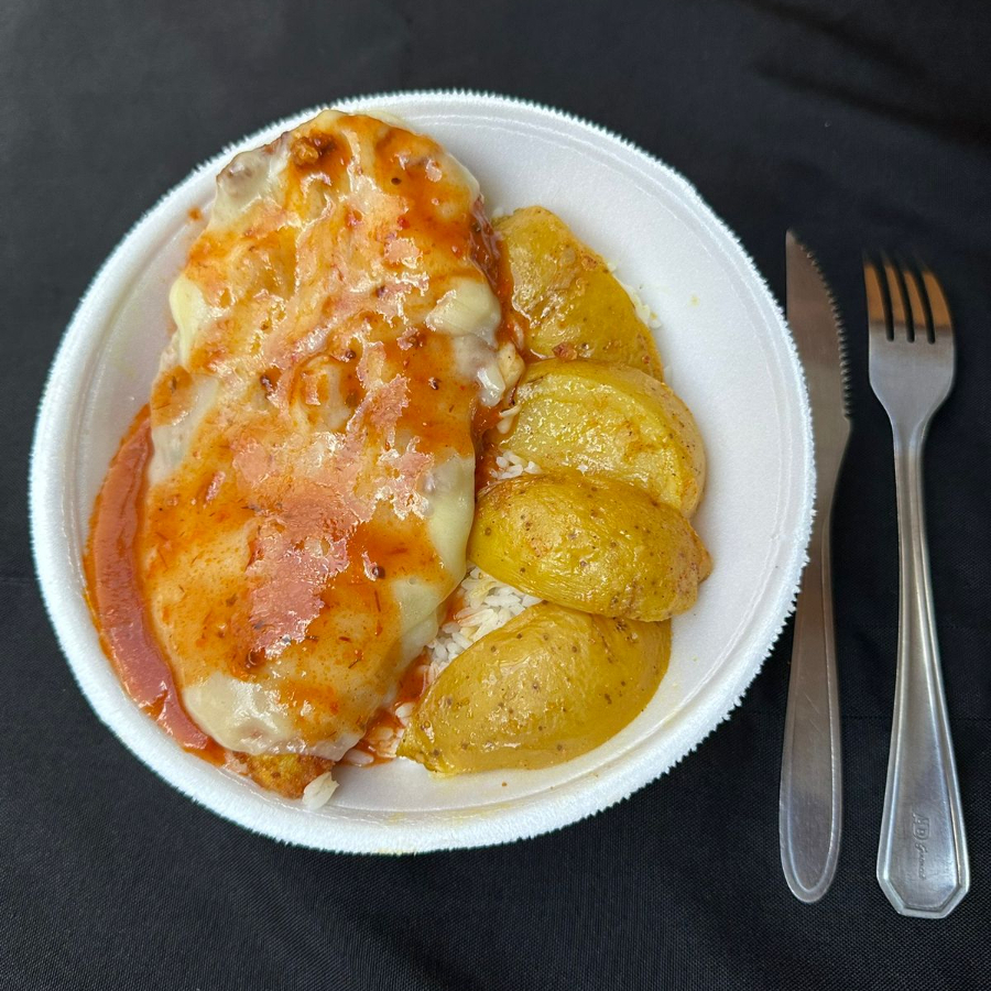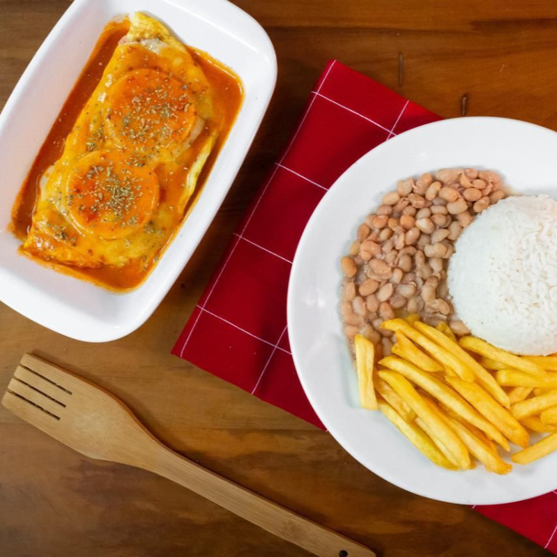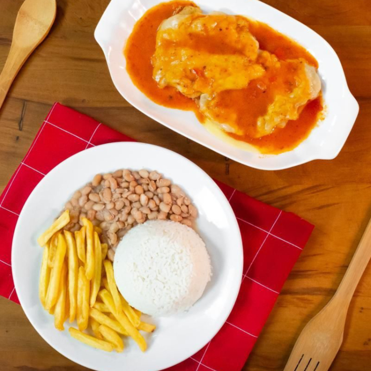 Acompanha: Arroz, Feijão, Batata Rustica, Filé de frango empanado com molho e queijo