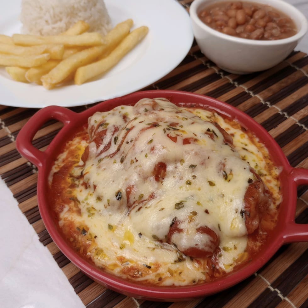 Escolha a carne entre frango ou contra à parmegiana preparado com molho de tomate caseiro, queijo muçarela e oregano acompanhado de arroz + batata frita (Essa opção não acompanha feijão e salada). Refeição com aproximadamente 360g