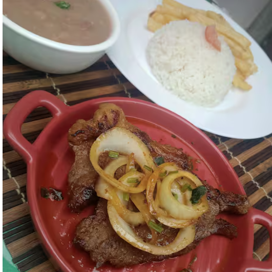 Acompanhamentos: Arroz branco , feijão carioca , bife acebolado, batata frita ( Essa opção nao Acompanha SALADA) Refeição de 360 Gramas