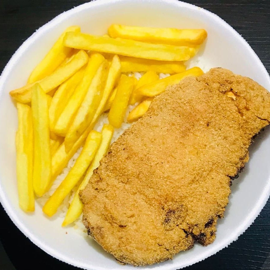 Acompanha arroz feijão fresquinho e batata frita
