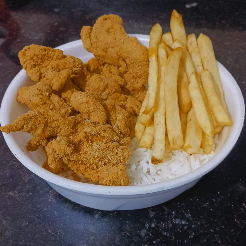 Duas Marmitas de Iscas de Frango Crocantes com desconto para combinar e acrescentar seu dia a dia, Acompanha arroz feijão e fritas.
