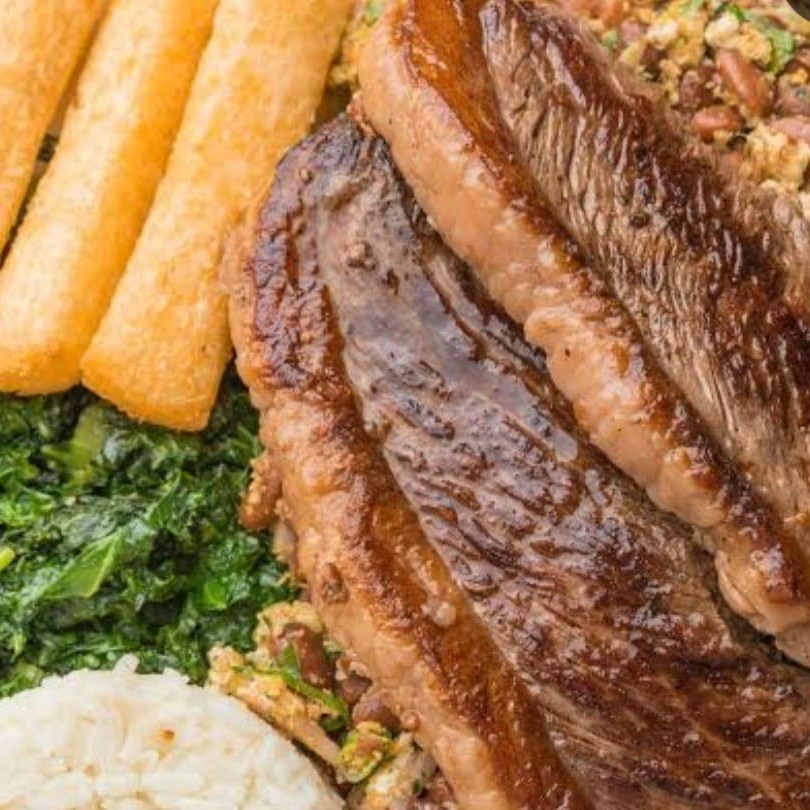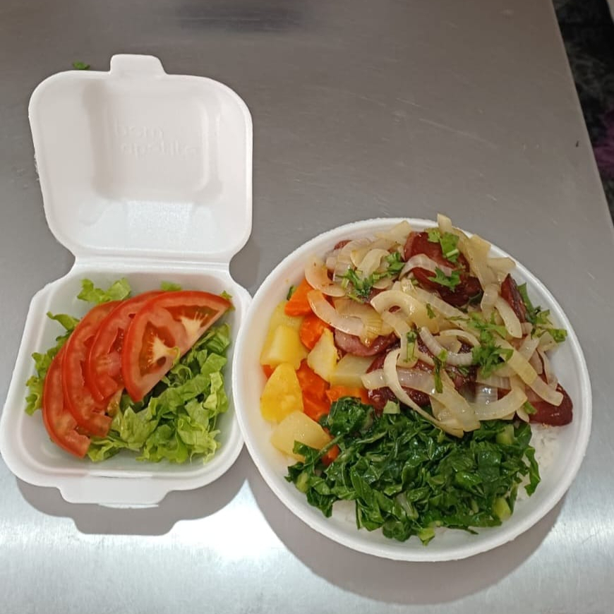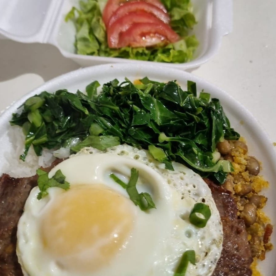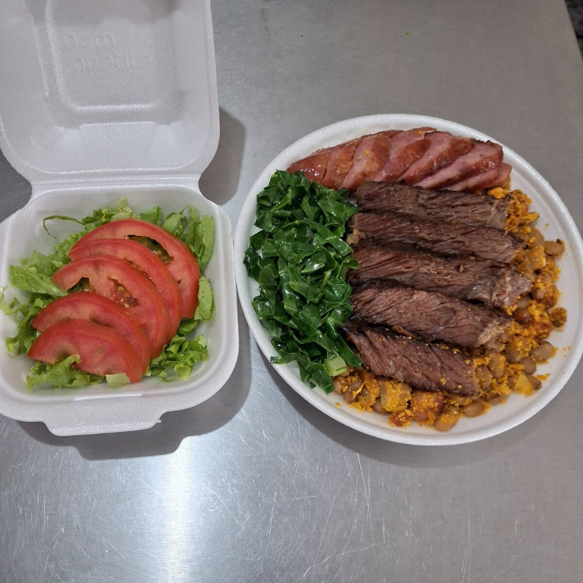 Acompanha Arroz Branco, Couve Refogado e Salda Fresca.