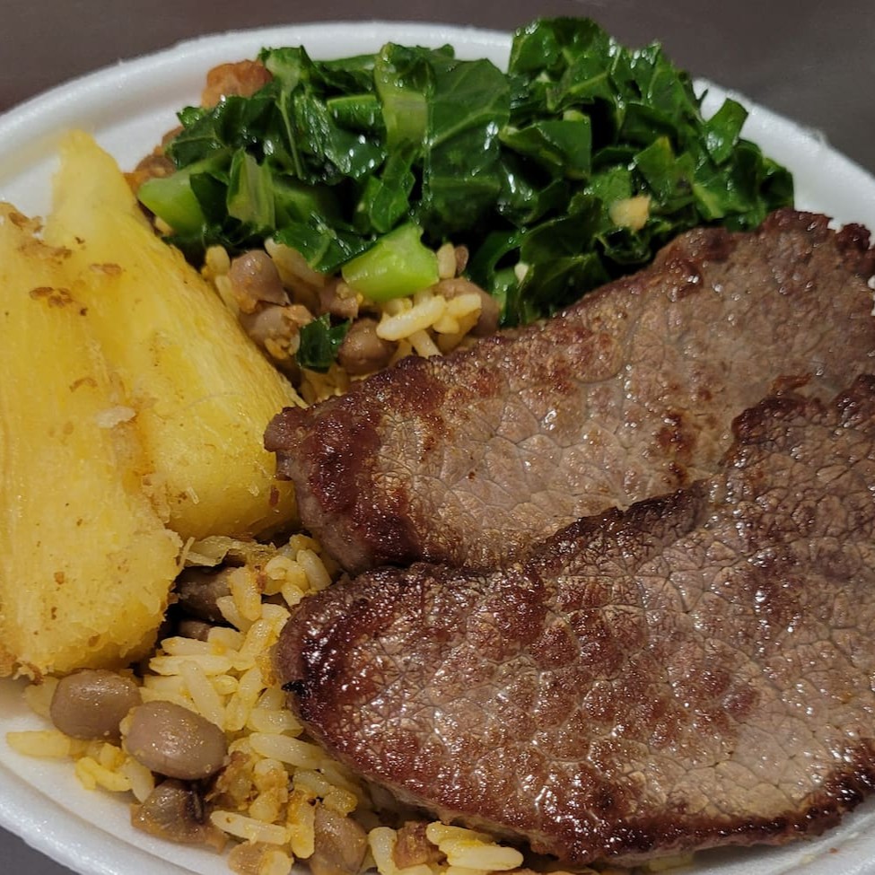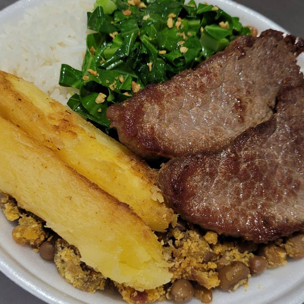 Contra filé grelhado suculento, coberto com ovo frito de gema macia. Acompanha feijão tropeiro leve, couve refogada, e salada fresca. Uma combinação deliciosa e equilibrada, perfeita para uma refeição completa e cheia de sabor! Aprx: 500g