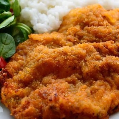 Filé de frango empanado , com molho de tomate e mussarela. Acompanha arroz branco , feijão e fritas.