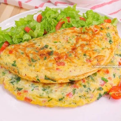 Omelete ( pimentão , cebola e tomate) Arroz , feijão e fritas.