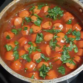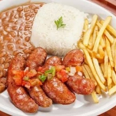 ARROZ BRANCO , FEIJÃO, SALSICHA AO MOLHO E FRITAS. *** FRITAS ENVIADAS SEPARADAMENTE EM OUTRA EMBALAGEM. ***