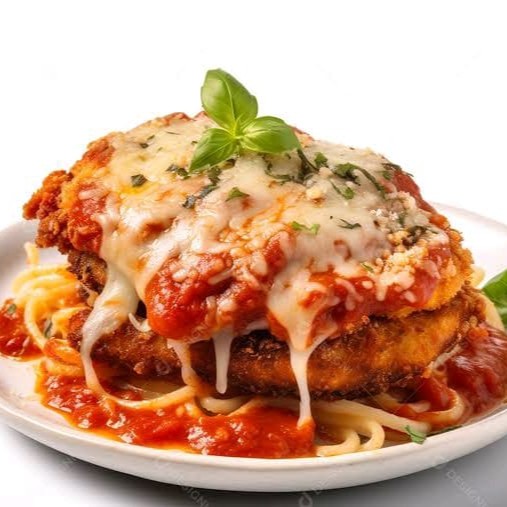 Filé de frango empanado , com molho de tomate , mussarelas e rodelas de tomate com azeite e o orégano. Acompanha arroz branco , feijão e fritas.