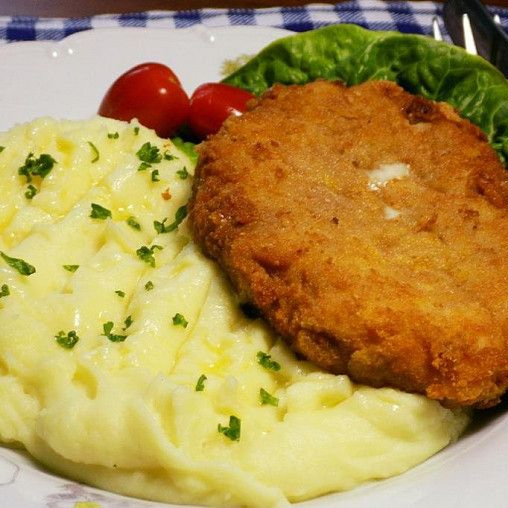 BIFE EMPANADO COM PURÊ DE BATATA, ACOMPANHA ARROZ BRANCO , FEIJÃO E PURÊ. *** NÃO ACOMPANHA FIRTAS NEM SALADA****