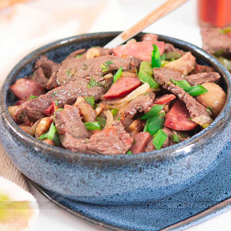 Iscas Mistas ( Carne E Calabresa) Acebolada Com Fritas.