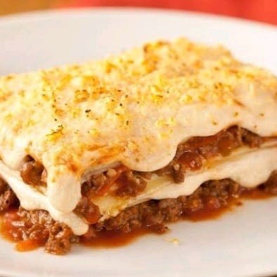 Lasanha a bolonhesa Acompanha: arroz, fritas