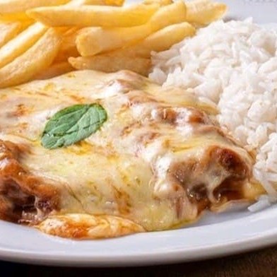 Parmegiana de carne, turbinada de queijo e muito molho. Acompanha, arroz, feijão e fritas .