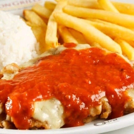Parmegiana de frango. Acompanha, arroz, feijão e batata frita.