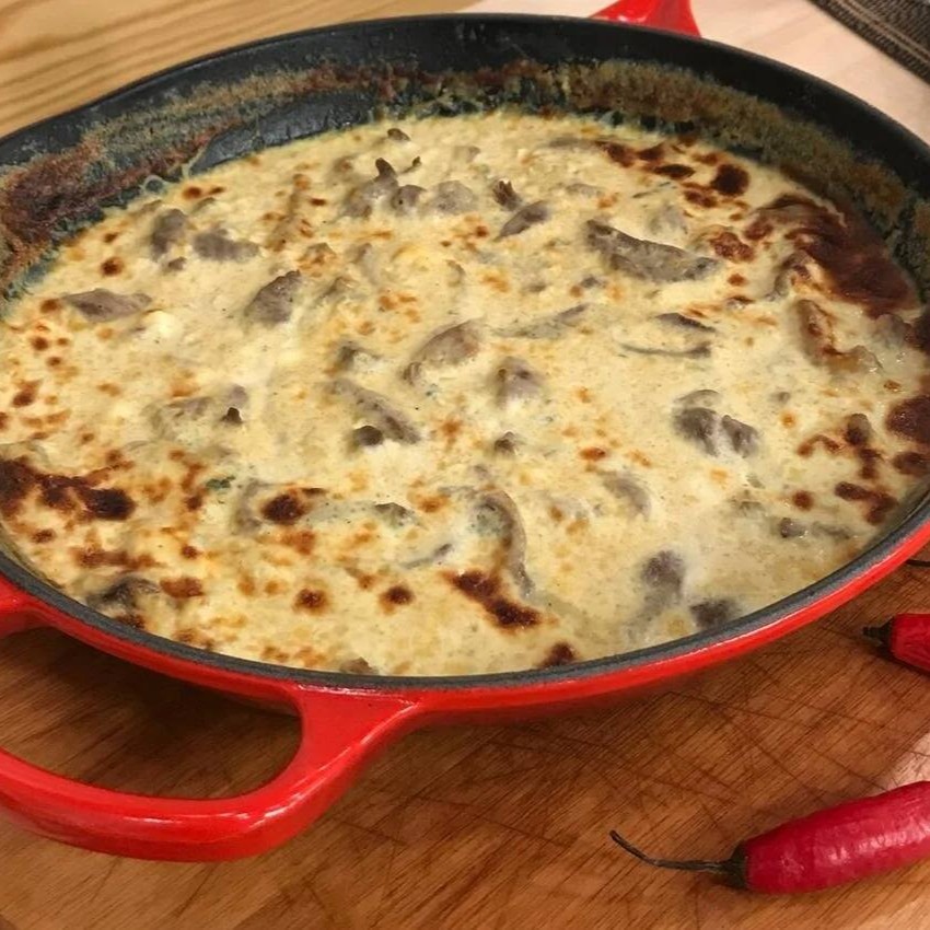 Tiras de contra filé, mergulhadas em muito queijo mussarela, Catupiry, parmesão e cheddar, acompanha pão de alho e molho da casa.