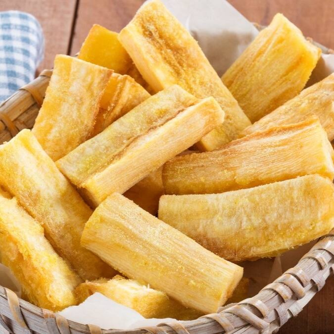 Carne seca desfiada puxada na manteiga, acompanhada de mandioca frita e molho da casa