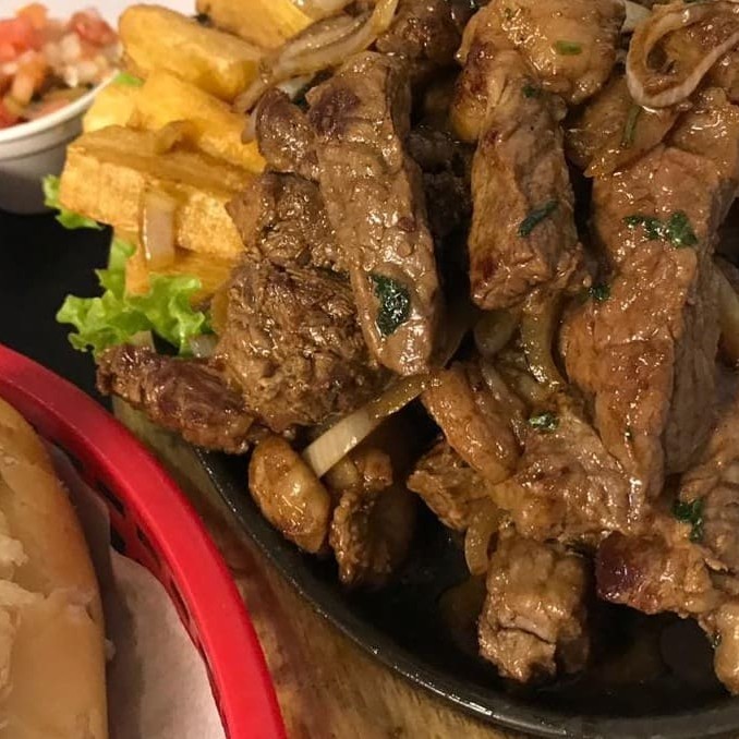 Suculentas tiras de contra file acebolada, acompanha pão de alho e molho da casa.
