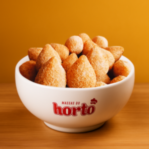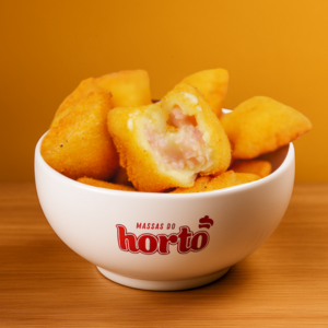 A clássica coxinha de frango da Massas do Horto é preparada com massa leve e recheio suculento de frango temperado. Ideal para qualquer ocasião, ela oferece o equilíbrio perfeito entre sabor e textura.