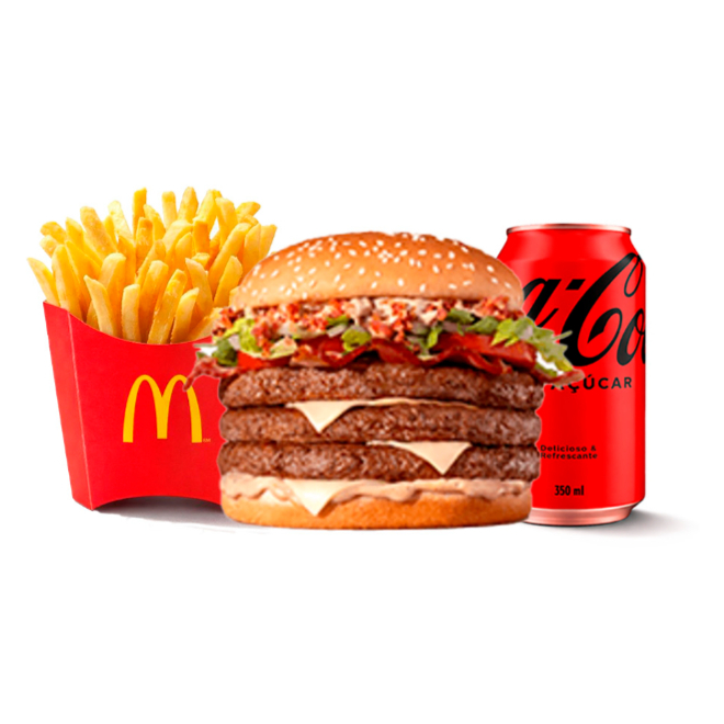 Composto por três hambúrgueres de carne 100% bovina, o icônico molho tasty, uma combinação especial de bacon crispy e fatias de Bacon, queijo processado sabor emental, tomate, alface, cebola, tudo isso no pão com gergelim, acompanhamento e bebida