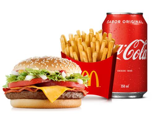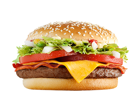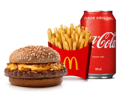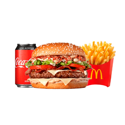 Três saborosas fatias de bacon, cebola, hambúrguer de 120 gramas de carne bovina, queijo derretido, tomate e um trio de delícias: maionese, ketchup e mostarda, acompanhamento e bebida. Consulte informações nutricionais do refrigerante 400ml em: mcdonalds.