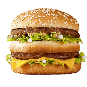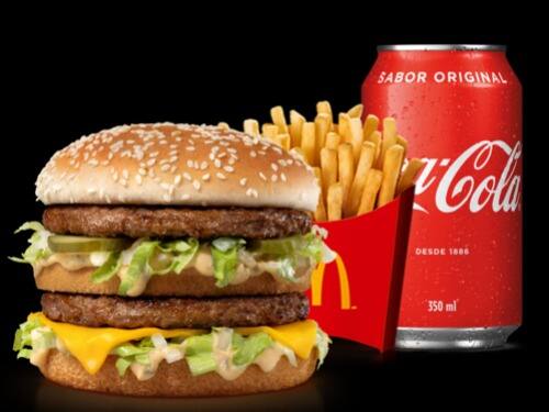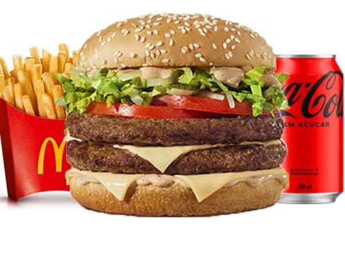 Dois hambúrgueres (100% carne bovina), alface americana, queijo cheddar, maionese Big Mac, cebola, picles e pão com gergelim, acompanhamento e bebida.