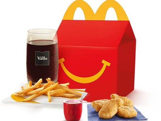 O McLanche Feliz acompanha 4 Chicken McNuggets com McFritas como acompanhamento, uma refrescante bebida e danoninho de morango como sobremesa. Brinquedo sujeito a disponibilidade de estoque por restaurante. Confira informações nutricionais em: mcdonalds.c