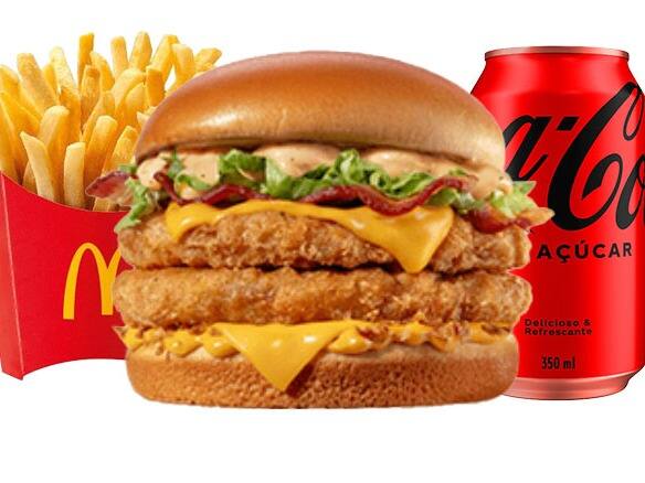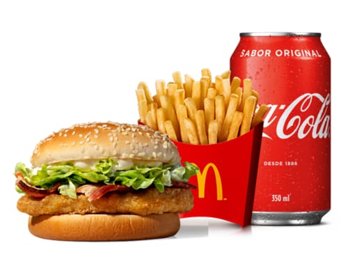 Frango empanado e dourado com molho suave e cremoso, acompanhado de alface fresquinho, fatias de bacon crocante num pão com gergelim, acompanhamento e bebida. Consulte informações nutricionais do refrigerante 350ml em: mcdonalds.com.br/cardapio/bebidas. N