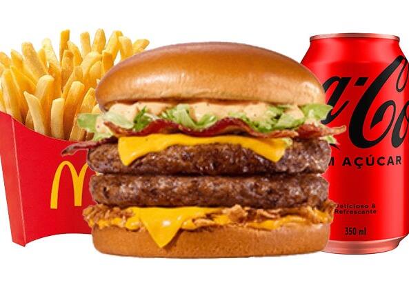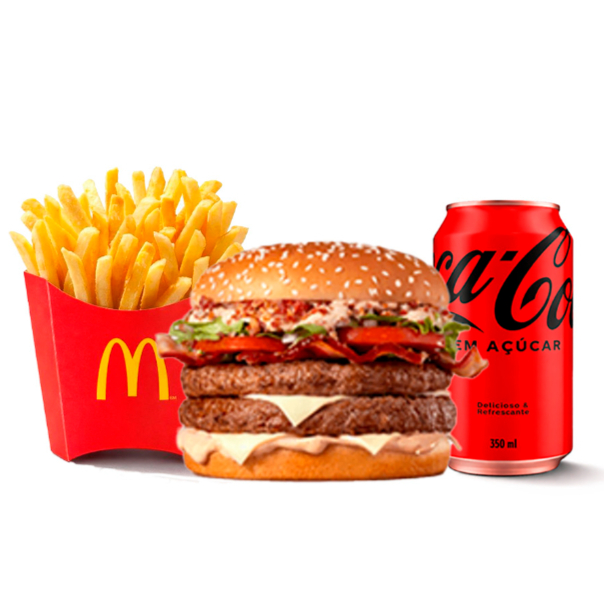 Composto por dois hambúrgueres de carne 100% bovina, o icônico molho tasty, uma combinação especial de bacon crispy e fatias de Bacon, queijo processado sabor emental, tomate, alface, cebola, tudo isso no pão com gergelim, acompanhamento e bebida
