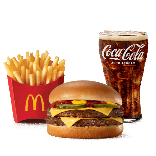 Um hamburguer (100% carne bovina), queijo cheddar, cebola, picles, ketchup, mostarda e pão sem gergelim, acompanhamento, bebida e McFlurry Ovomaltine Rocks