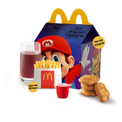Aproveite o Mccombo Super Mario Galaxy O Filme que é composto por: 1 (uma) McOferta de: Big Mac, Quarterão com Queijo, 10 (dez) Chicken McNuggets ou 15 (quinze) Chicken McNuggets e 1 (um) molho inspirado no universo do Mario — Molho sabor cogumelo, Molho