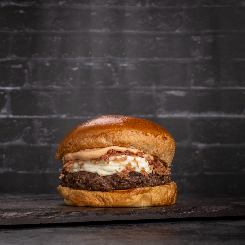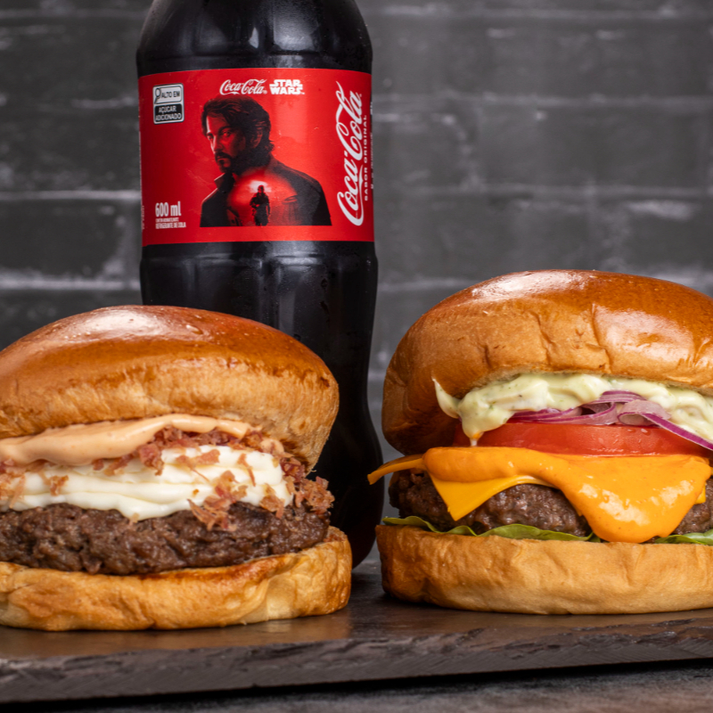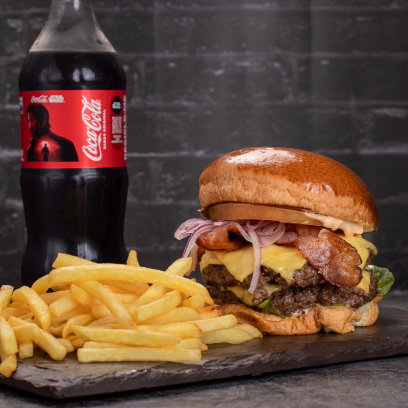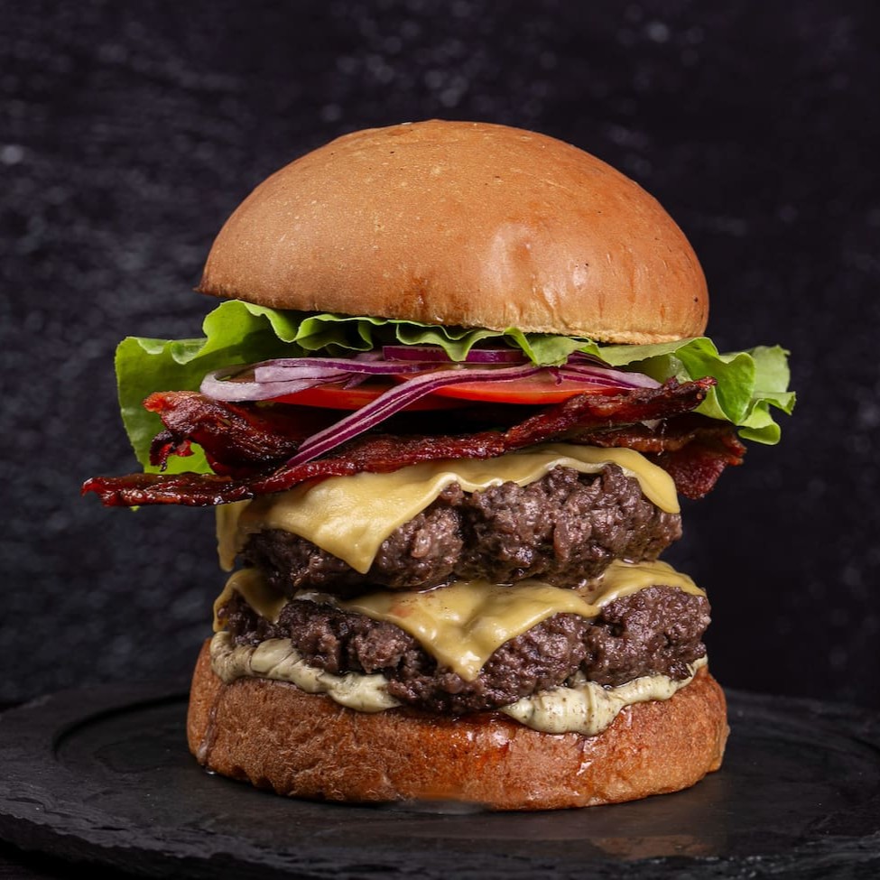 2 Burger de 140g (cada) Queijo prato deretido Fatias de Bacon Crocante Maionese da casa Tomate,cebola roxa e alface fresca *Imagem meramente ilustrativa.