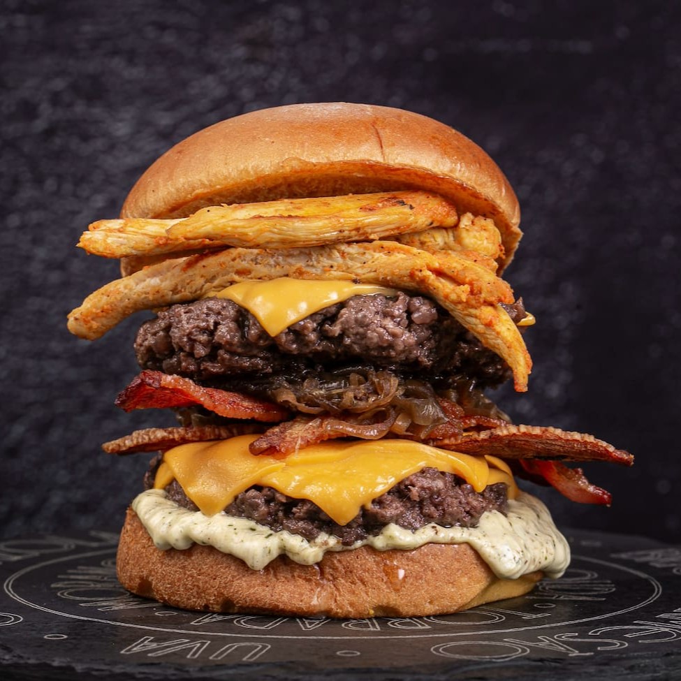 2 Burgues de 140g Tiras de frango na chapa Cheddar fatiado creme Sheese Original Maionese Verde Fatias de Bacon Crocantes Cebola Caramelizada Pão de Brioche Artesanal bem macio. *Imagem meramente ilustrativa.