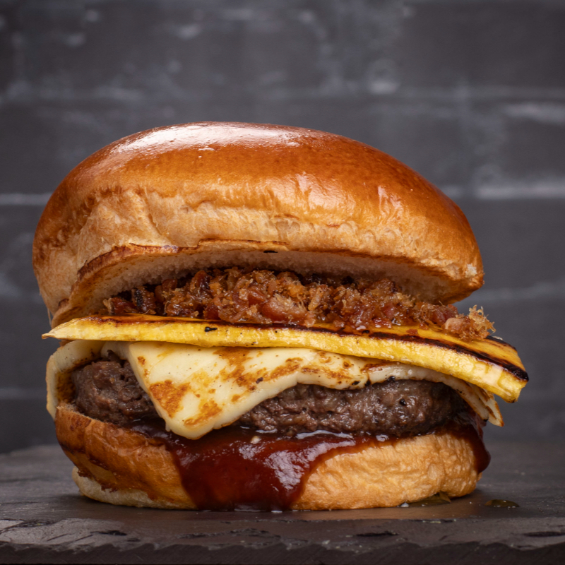 Burger 140g Banana da terra na chapa Queijo qualho maçarido pincelado de mel Bacon triturado molho Bbq *Imagem meramente ilustrativa.