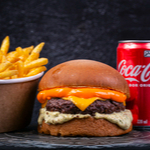 Burguer de 140g Cheddar fatiado Creme cheddar da casa Maionese verde Cebola roxa Alface Tomate Fresco Batata Media Pão de Brioche Artesanal bem macio. *Imagem meramente ilustrativa.