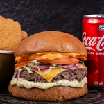 Burguer 140g Cheddar fatiado Creme cheddar Maionese Verde Pão de Brioche Artesanal bem Macio + nuggets + bebida