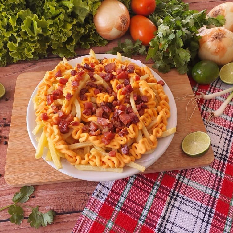 Deliciosa porção de Batata com Calabresa em tamanho grande. O prato é composto por batatas fritas crocantes e douradas, acompanhadas de calabresa fatiada e cuidadosamente grelhada para garantir o máximo de sabor. O conjunto é harmonizado com o frescor de cebolas cortadas em rodelas finas. Para finalizar, uma nutritiva salada fresca agrega cor e leveza ao prato. Essa combinação certamente fará seu