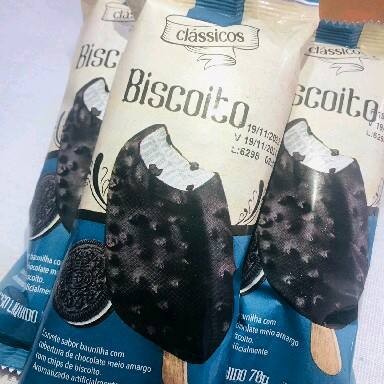 Sorvete sabor baunilha com cobertura de chocolate meio amargo com Chips de biscoito