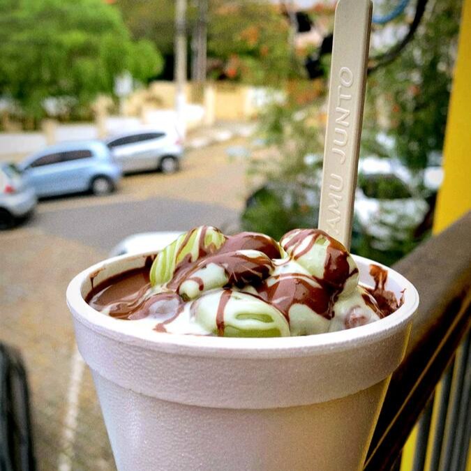 Sorvete sabor pistache com cobertura de chocolate branco e amendoim.