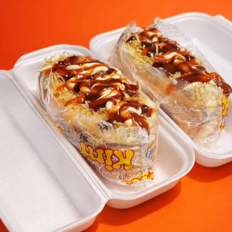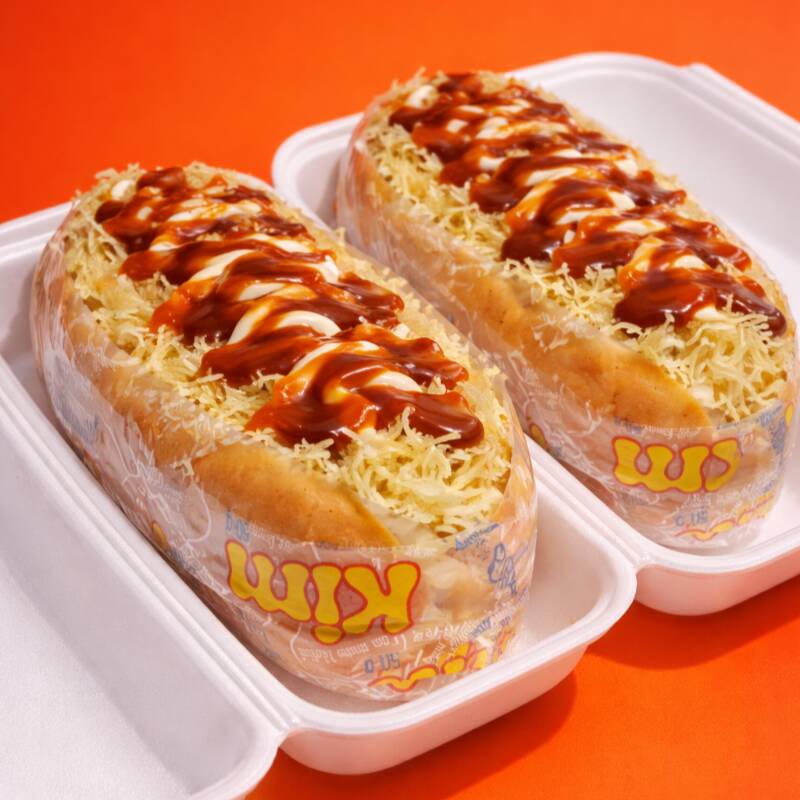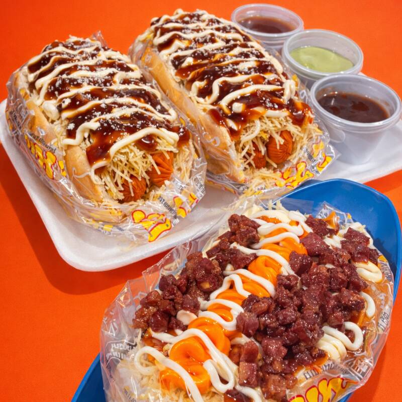 2 salsichas, purê de batata, milho, batata palha, ketchup, maionese, catupiry, cheddar, bacon e queijo ralado.