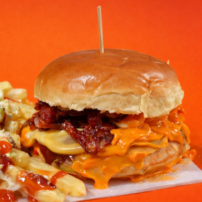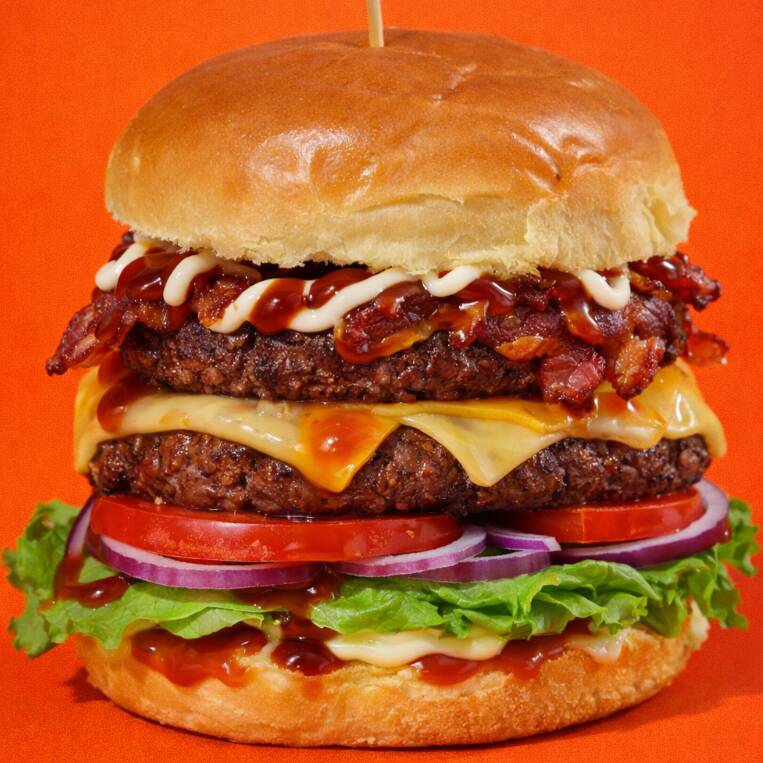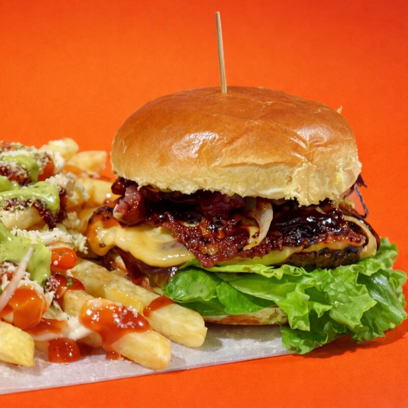 2 Hambúrgueres, alface, tomate, cebola roxa, bacon, queijo prato, barbecue, maionese, ketchup.