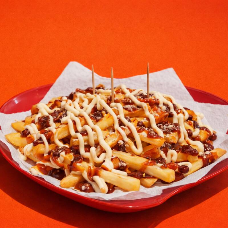 1 Salsicha, purê de Batata, milho, batata Palha, ketchup, maionese, barbecue e queijo ralado.