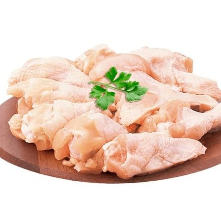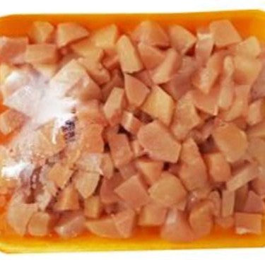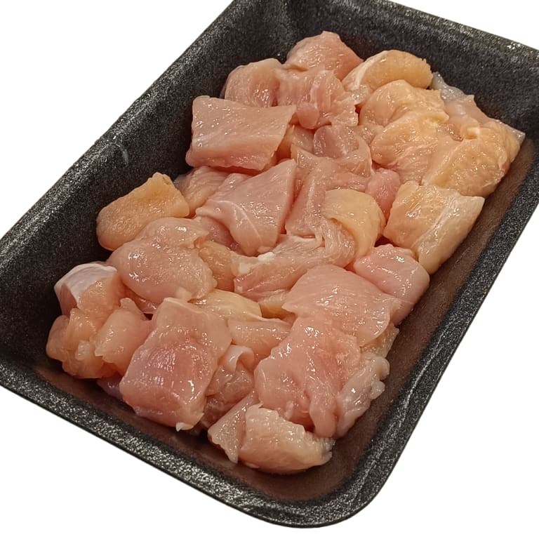 Peito de frango macio e limpo em cubos grandes.