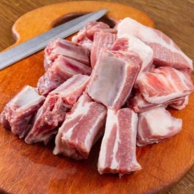 Costela suína fresquinha cortada em pedaços pequenos.