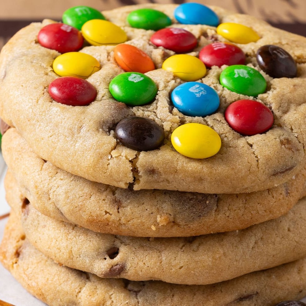 Cookie feito com massa de bauilha, gotas de chocolate ao leite e M&M's. Assados sob pedido para que chegue até você ainda morninho.