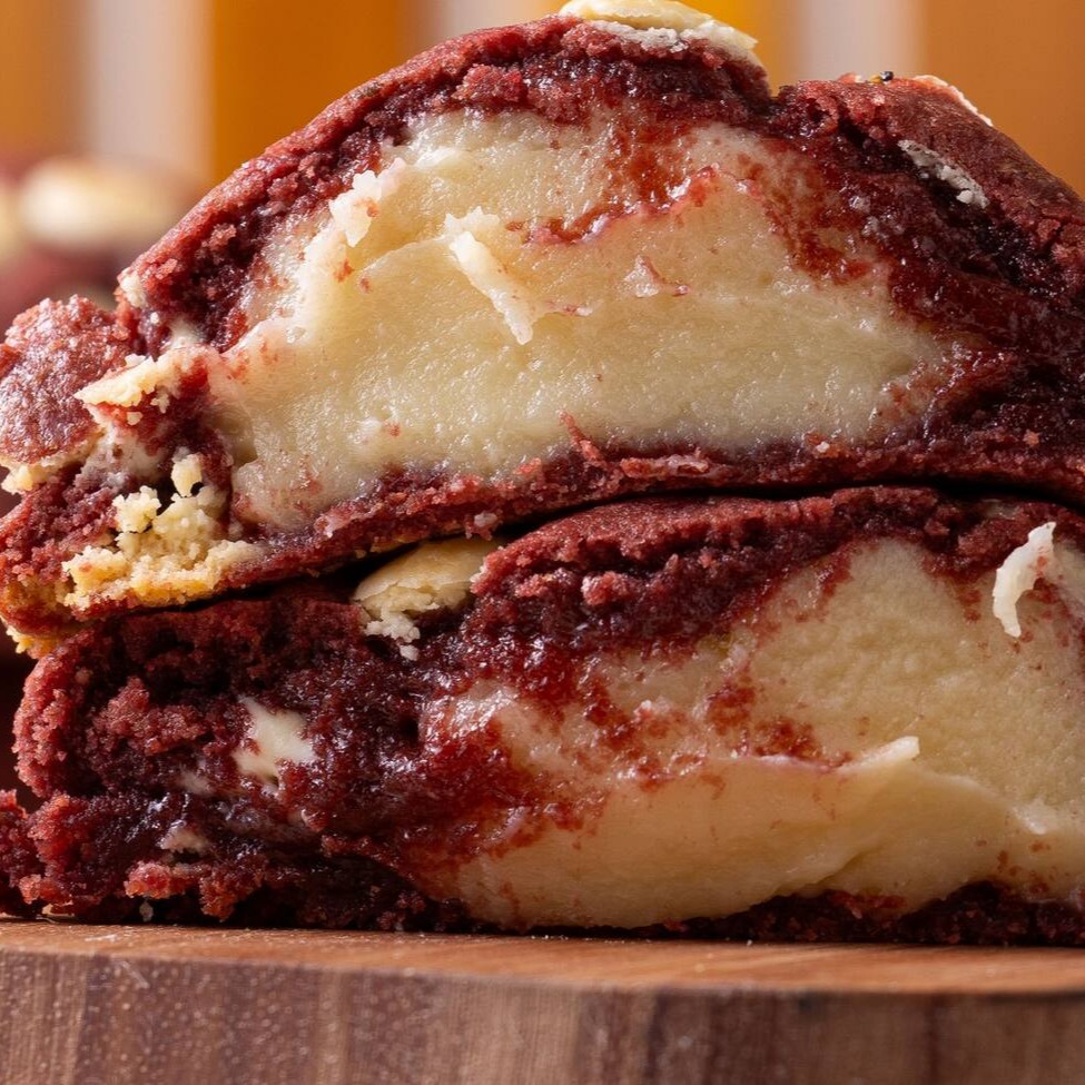 Massa red velvet, recheio de Leite Ninho e gotas de chocolate branco. Peso aproximado 100g. Assados sob pedido para que chegue até você ainda morninho.