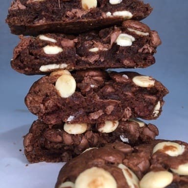 Massa de chocolate, recheio de Chocolate branco e gotas de chocolate branco. Assados na hora para que chegue até você ainda morninho.