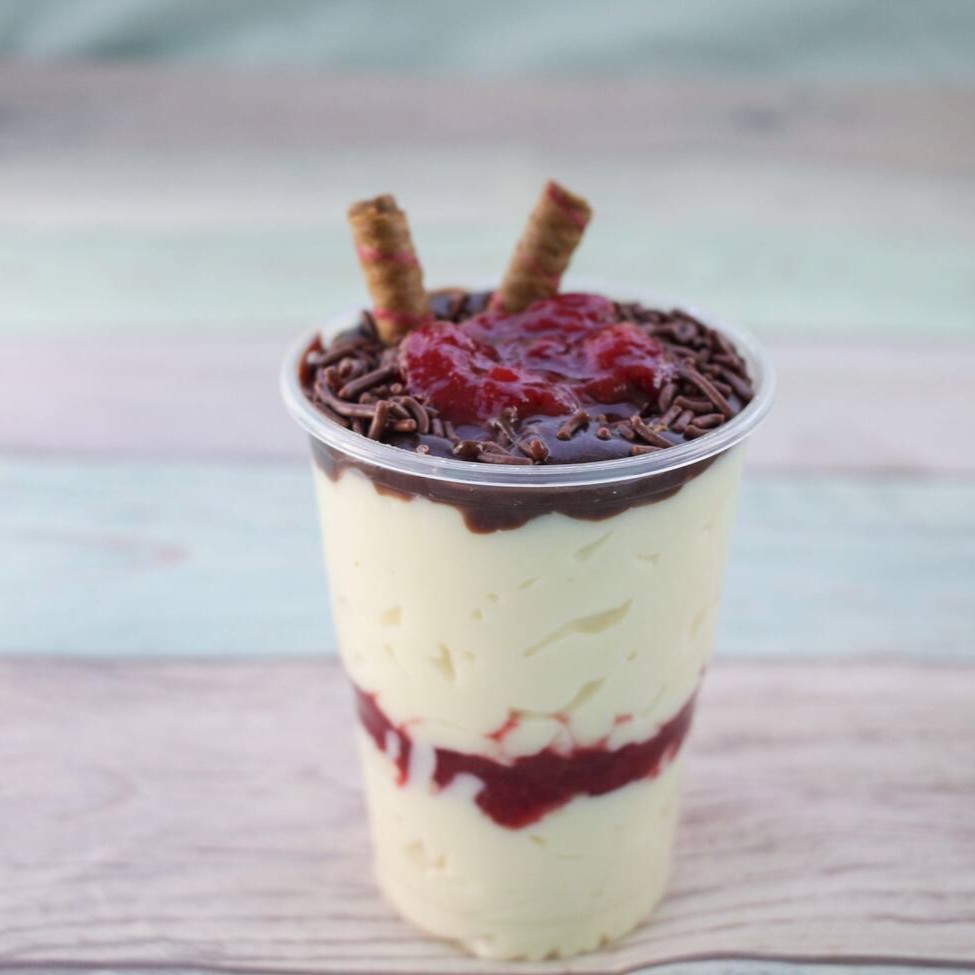 Delicioso Copo Bombom C/ Geleia da Fruta, prepardo Preparado com Brigadeiro cremoso de Leite Ninho, geleia de Morangos , coberto com mais uma camada de Brigadeiro de Leite Ninho, uma suave Ganache, Granulados, e finalizado com um Canudo de biscoito e Geleia de Morango fresco.