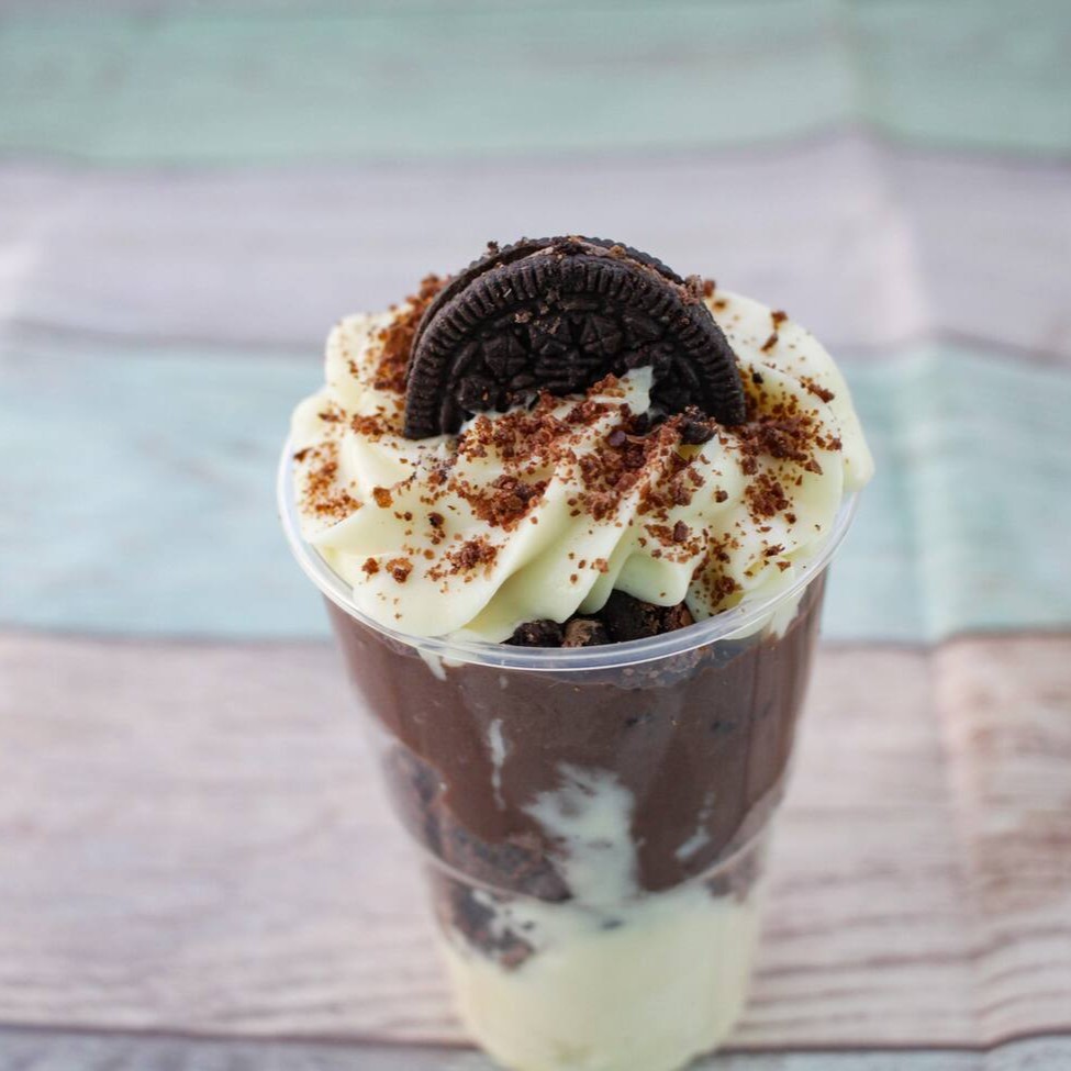 Delicioso Copo da Felicidade com Oreo, preparado com Brigadeiro cremoso de Ninho, Pedaços de Oreo triturados coberto com Creme de Ninho e finalizado com uma Biscoito Oreo.