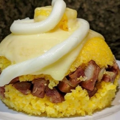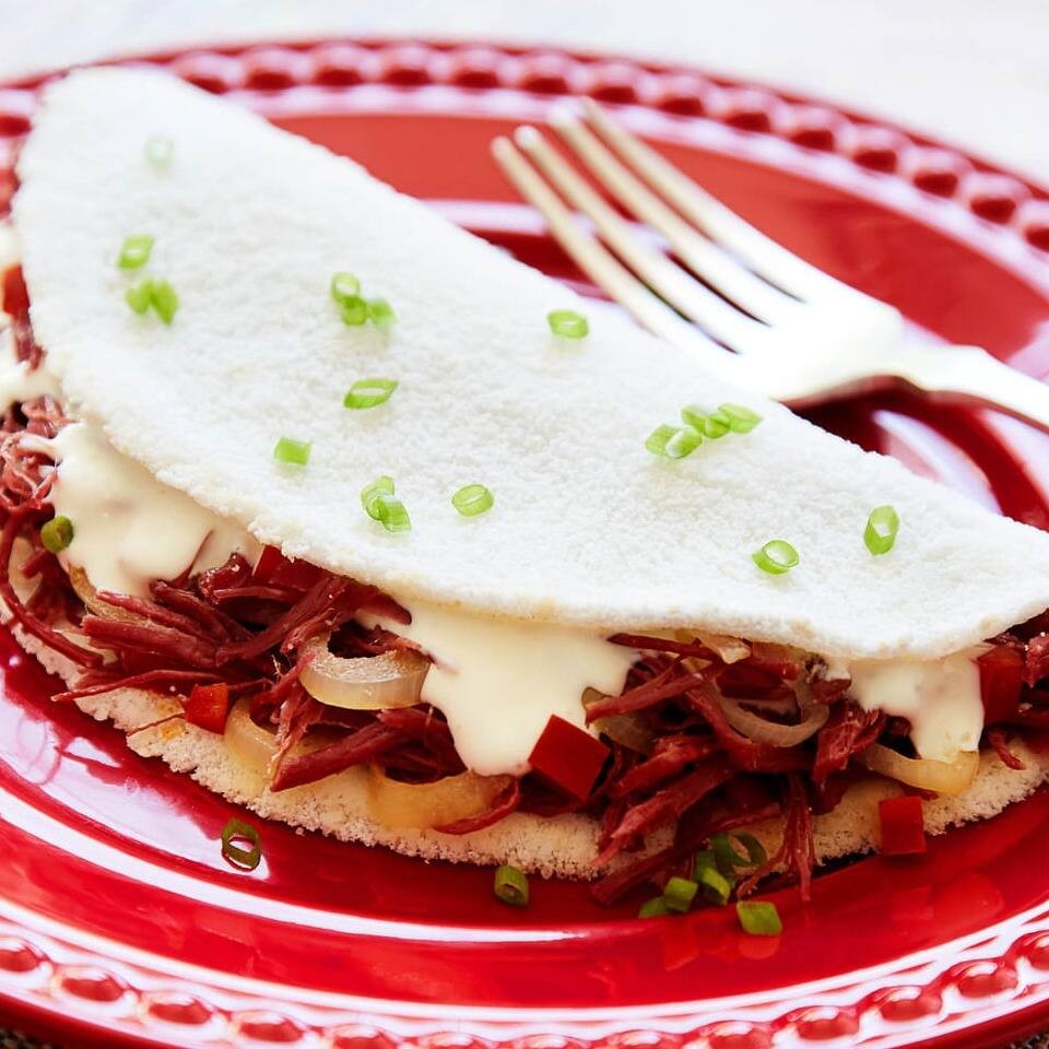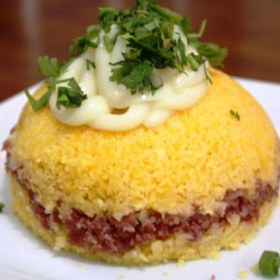 Cuscuz de 500g, feito na hora. Recheado com carne seca desfiada e Catupiry Original ao meio e por fora. Serve 1 pessoa