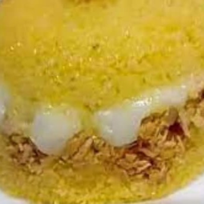 Cuscuz de 500g, feito na hora. Recheado com ovo e mussarela ao meio e por fora. Serve 1 pessoa